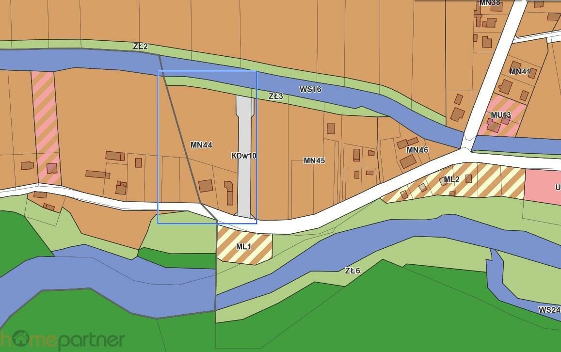 Teren objęty MPZP, zgodnie z planem oznaczony symbolem MN44 z przeznaczeniem jako teren zabudowy mieszkaniowej jednorodzinnej, cześć nad rzeką to ZŁ3 tereny zieleni łęgowej i od wschodniej granicy działki KDw10 z przeznaczeniem pod drogę wewnętrzną.